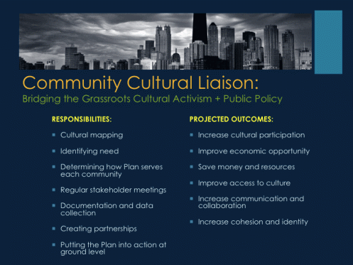 What I’ve heard at many NCCs but also at artist based meetings– is that we [all] must activate this plan, continue to be aligned with the evolution of the plan. We all have a responsibility for making the plan come alive. Artists have been at the forefront of neighborhood revitalization and should be at the forefront of this conversation, at the center of the neighborhood creative think tank in looking at culture. Liaisons interfacing with neighborhoods in a way that is meaningful, proactive and invested…we must continue to listen to voices of the neighborhood. These cultural workers {cultural liaisons} would be the active ears to those voices & ideas…